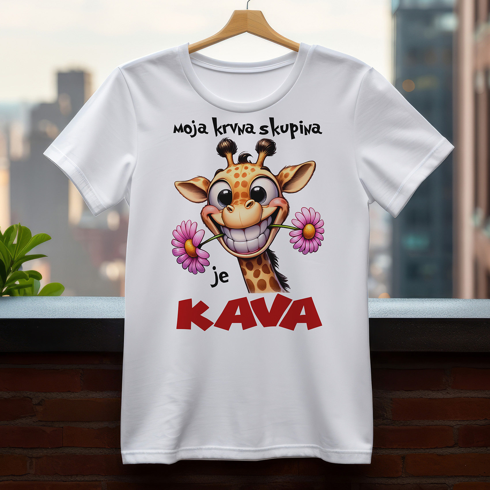 Majica z simpatično grafiko nasmejane žirafe z rožico v ustih in velikim barvnim napisom: "MOJA KRVNA SKUPINA JE KAVA"Zabavna, barvita in zelo relatable majica za vse prave kavopivce, ki vedo, da kava ni samo pijača – je življenjska tekočina, jutranja oživitev in njihova prava krvna skupina.Popolna za lenobna jutra, pisarno, remote delo, kavarniške izhode ali kot odlično darilo za kavopivca.Nosite jo ponosno in spomnite svet: brez kave sem samo žirafa brez vratu.