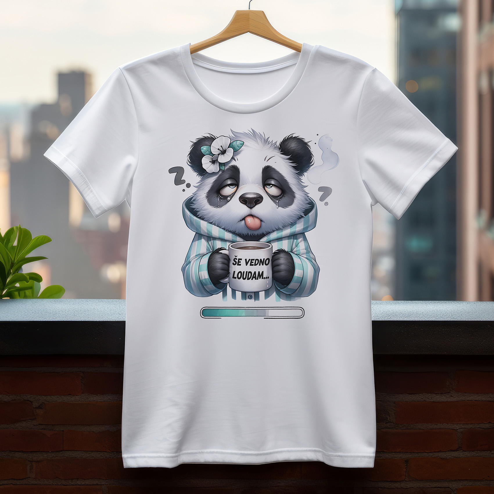 Majica z simpatično grafiko zaspane pande z rožicami na ušesih, ki objema ogromno šalco kave. Na šalci piše "ŠE VEDNO LOADAM", spodaj pa je loading bar, ki se počasi polni.Zabavna, barvita in ultra relatable majica za vse, ki se zjutraj (ali opoldne) še vedno "loadajo" – ker brez kave ni šans za normalno delovanje.Popolna za remote delo, pisarno, lenobna jutra ali kot odlično darilo za kavopivca, ki živi v perpetual "loading" stanju.Nosite jo ponosno in spomnite svet: še vedno loadam… ampak vsaj kava teče.