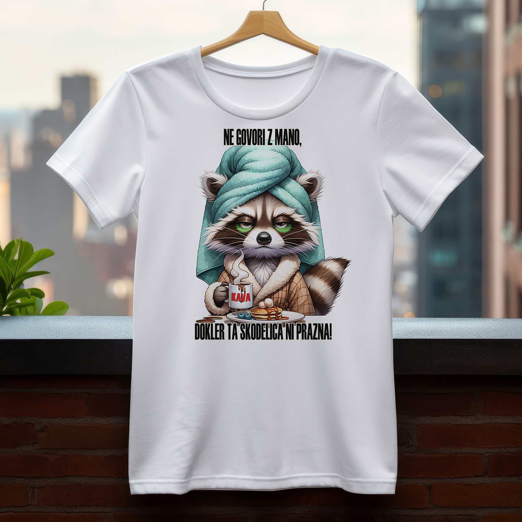 Majica z simpatično, a jezno grafiko rakunke v jutranji halji in brisači na glavi, ki varuje svojo skodelico kave, ter velikim napisom: "NE GOVORI Z MANO dokler ta skodelica ni prazna"Ultra relatable in humorno-iskrena majica za vse, ki zjutraj niso "morning person" – ampak "ne govori z mano dokler kava ni končana" person.Popolna za lenobna jutra, remote delo, pisarno ali kot odlično darilo za kavopivca, ki zjutraj potrebuje svoj mir.Nosite jo ponosno in jasno sporočite: najprej kava, potem pa mogoče človeški stik.