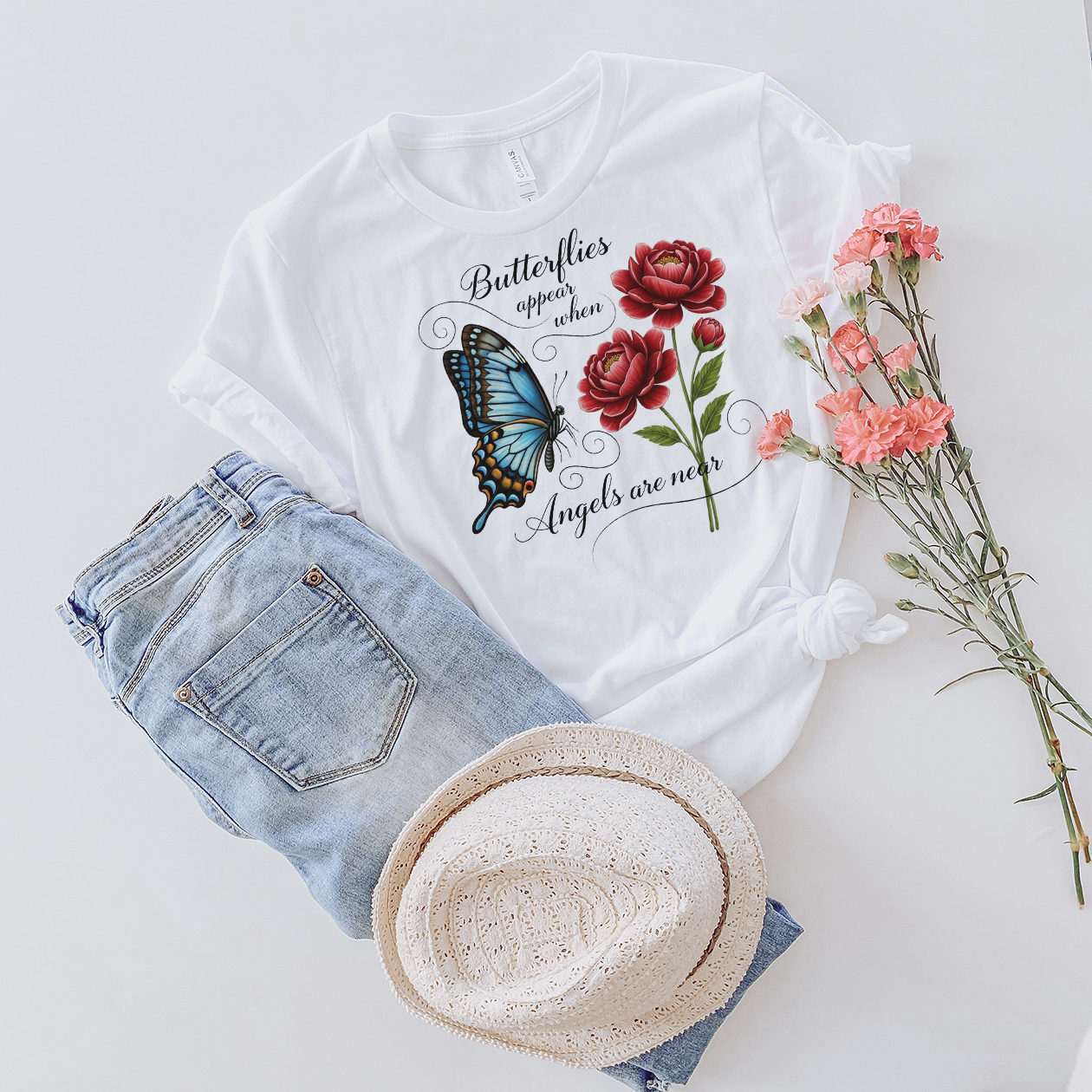 Majica z nežnim in čarobnim angleškim napisom: "BUTTERFLIES APPEAR WHEN ANGELS ARE NEAR"Obdan z romantično grafiko: čudovite vrtnice v polnem cvetu in velik, prelep moder metulj, ki nežno lebdi med njimi.Metulj simbolizira angelsko prisotnost, zaščito in duhovno povezavo, vrtnice pa ljubezen, lepoto in spomin na drage osebe.Mehka, zračna in kvalitetna bombažna majica, ki je idealna za mirne trenutke, sprehode, vsakdanje opravke ali kot zelo globoko in tolažilno darilo.
