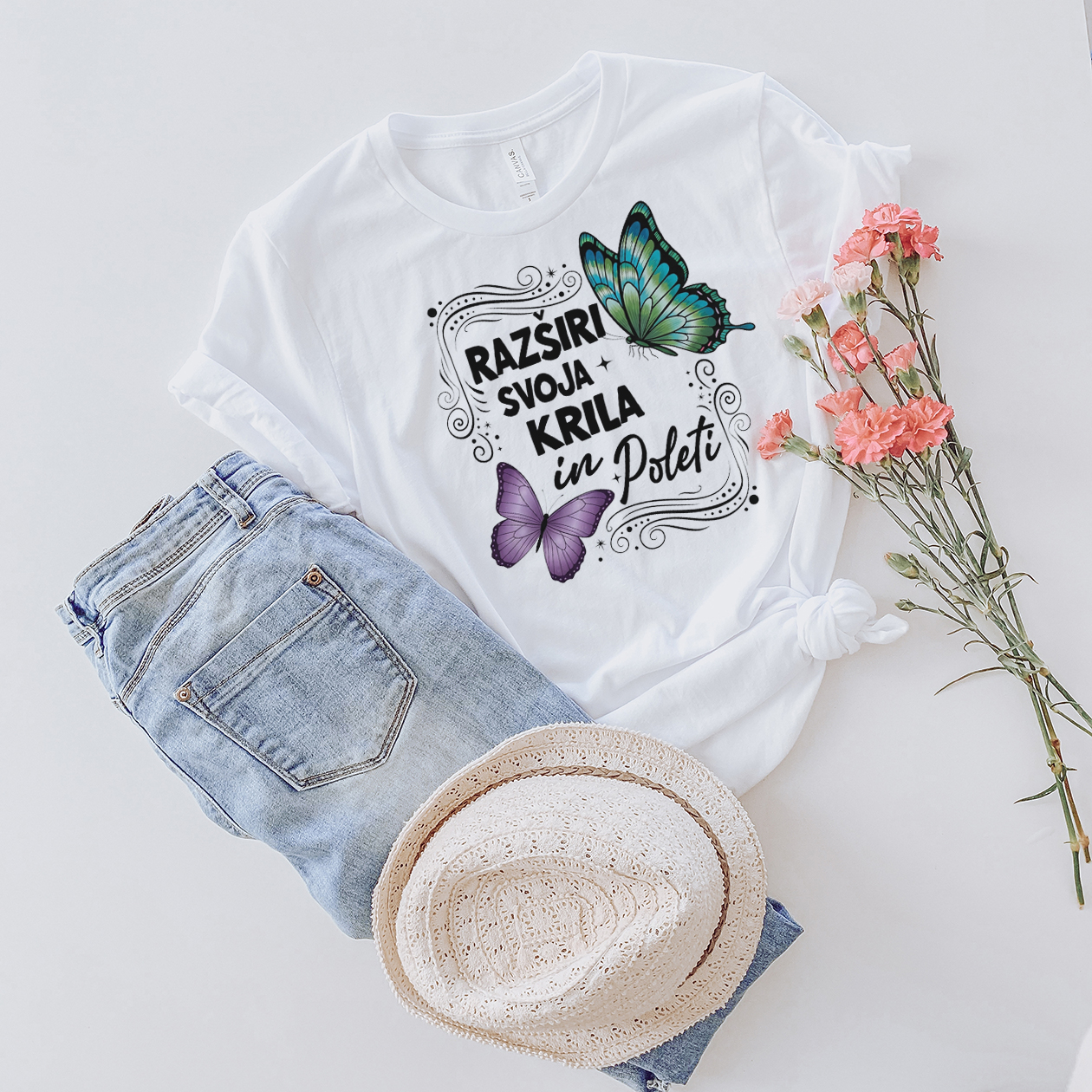 Majica z močnim in navdihujočim napisom: "RAZŠIRI SVOJA KRILA IN POLETI"Obdan z dvema elegantnima metuljema – simboloma preobrazbe, rasti in svobode.Vsak dan, ko jo oblečete, postanete svoj lasten opomnik: čas je, da stopite iz cone udobja in poletite proti temu, kar si res želite.Mehka, zračna in kvalitetna bombažna majica, ki je idealna za vsakdanje dni, nove začetke, izzive ali preprosto za občutek, da si pripravljen/a na več.