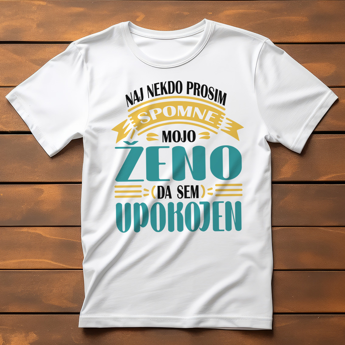 Majica s prelepo grafiko in velikim, duhovitim napisom: "NAJ NEKDO PROSIM SPOMNI MOJO ŽENO, DA SEM UPOKOJEN"