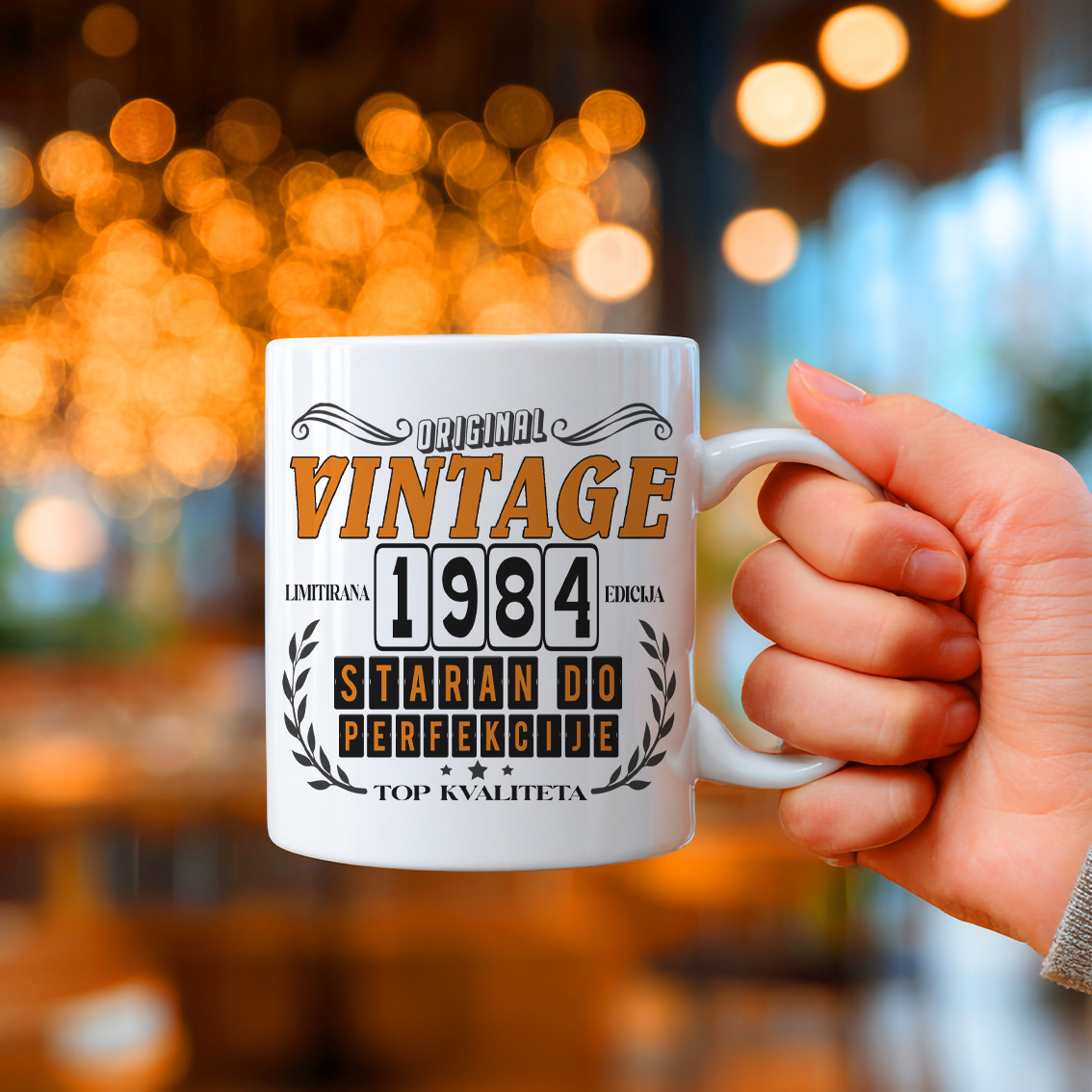 Šalica z napisom: ""ORIGINAL VINTAGE – LIMITIRANA EDICIJA [letnica]", pod tem "STARAN / STARANA DO PERFEKCIJE"". Čista vintage estetika z retro napisom